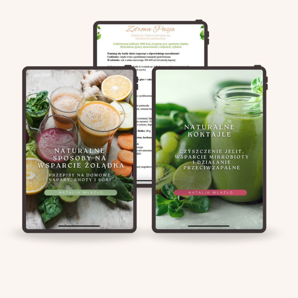 Stworzyłam dla ciebie pakiet, który pomoże Ci skutecznie zmniejszyć lub całkowicie pozbyć się tych nieprzyjemnych dolegliwości. W pakiecie znajdziesz 3 materiały PDF: lekkostrawny jadłospis na 3 dni, przepisy na koktajle (oczyszczające, dokarmiające dobre bakterie, antyzapalne) oraz mój przepiśnik z autorskimi naparami, shotami i sokami, które sprawdzą się przy problemach z bólem żołądka, Helicobacter, przy zaparciach, zapaleniach w układzie pokarmowym i problemach trawiennych.
